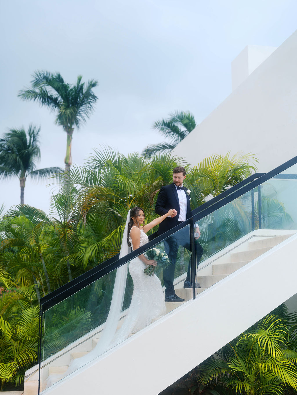 Following their ceremony, I worked with Vian and Jacob to explore the resort, capturing Finest Playa Mujeres wedding photography. The resort features modern architecture set against the tropical landscape of the coast. Bright white buildings were juxtaposed with lush green palm trees that swayed with the wind. Each moment spent in this alluring landscape with Vian and Jacob was focused on creating new memories. Cherished occasions to be recalled throughout their lifetime together.